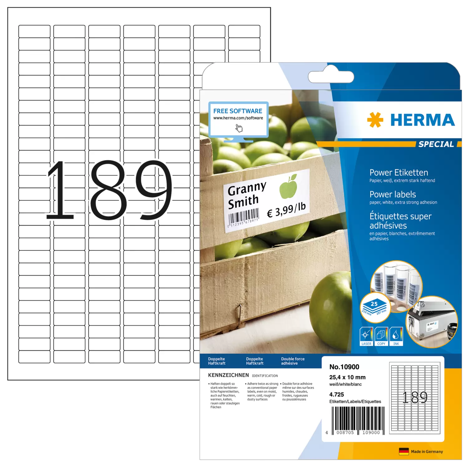 Power-etiketter, kraftigt vidhäftande A4, 25,4 x 10 mm, vita, av papper