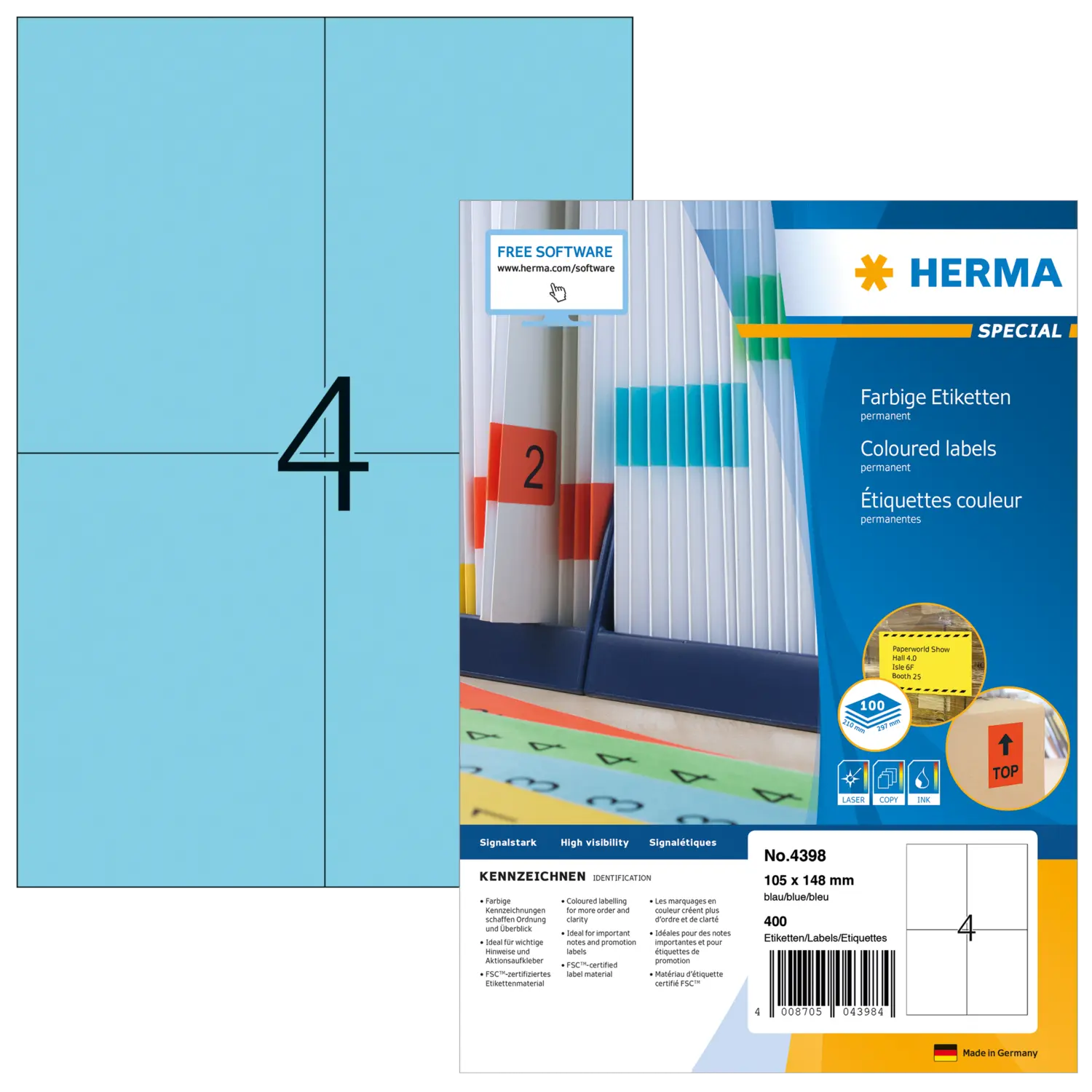 Färgade etiketter A4, 105 x 148 mm, blå papper matt 400 st.
