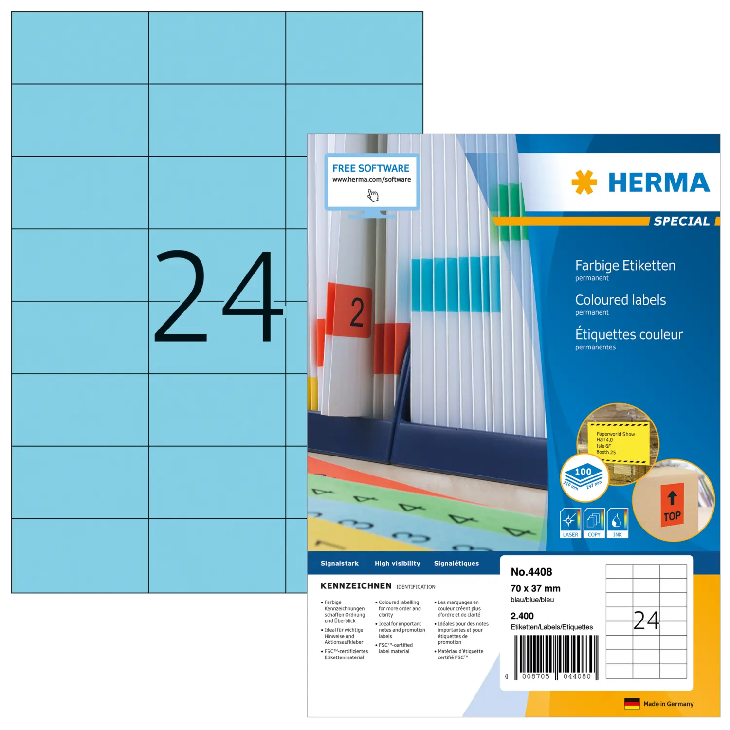 Färgade etiketter A4, 70 x 37 mm, blå papper matt 2400 st.