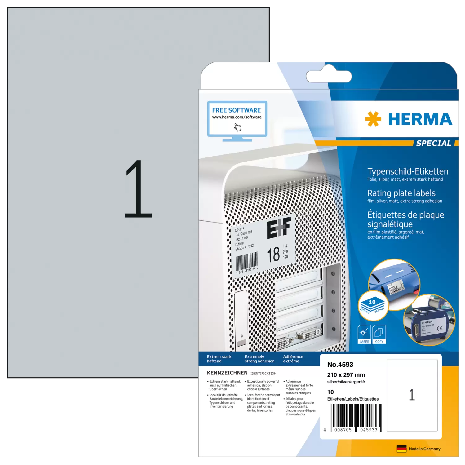 Typskyltsetiketter A4, 210 x 297 mm, silver, extremt kraftigt vidhäftande, väderbeständiga, draghåll